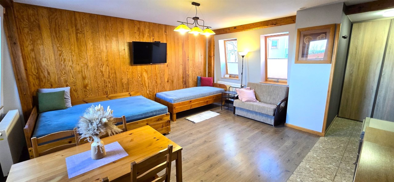 Pensjonat oferuje 4 komfortowe apartamenty (2 na parterze oraz 2 na I piętrze) składające się z przestronnego salonu z aneksem kuchennym i łazienką (każdy), wyjście na taras, ogród. Obiekt cieszy się dużym zainteresowaniem turystów dzięki doskonałej lokalizacji.