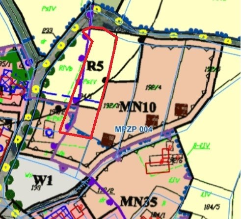 Na terenie jest Miejscowy Plan Zagospodarowania Przestrzennego - symbol MN/10 oraz R5 - - przeznaczenie pod zabudowę jednorodzinną mieszkaniową oraz w części rola.