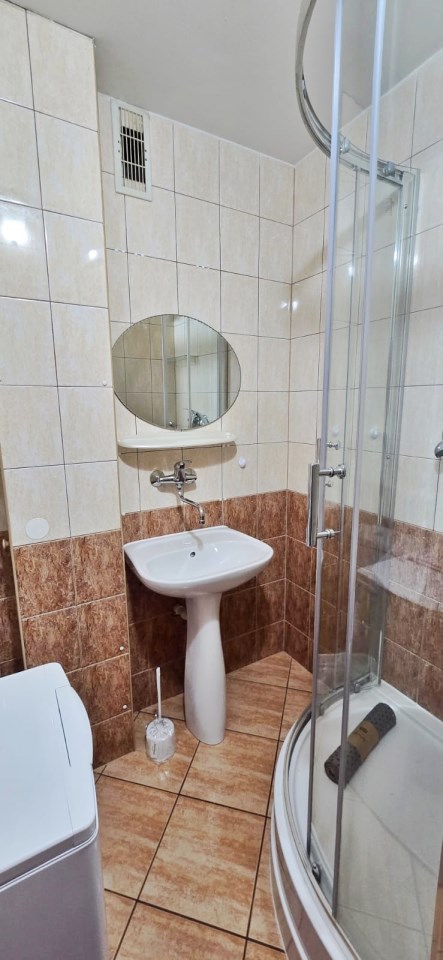 Wyposażenie łazienki | kabina prysznicowa, lustro, pralka, prysznic, umywalka, WC |
