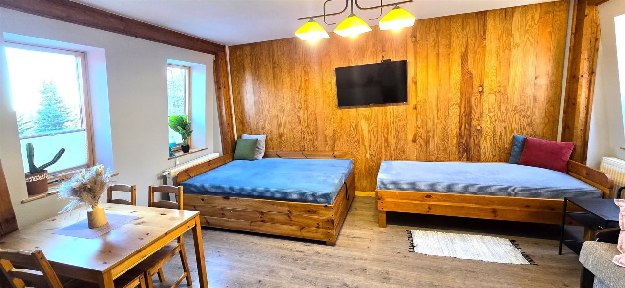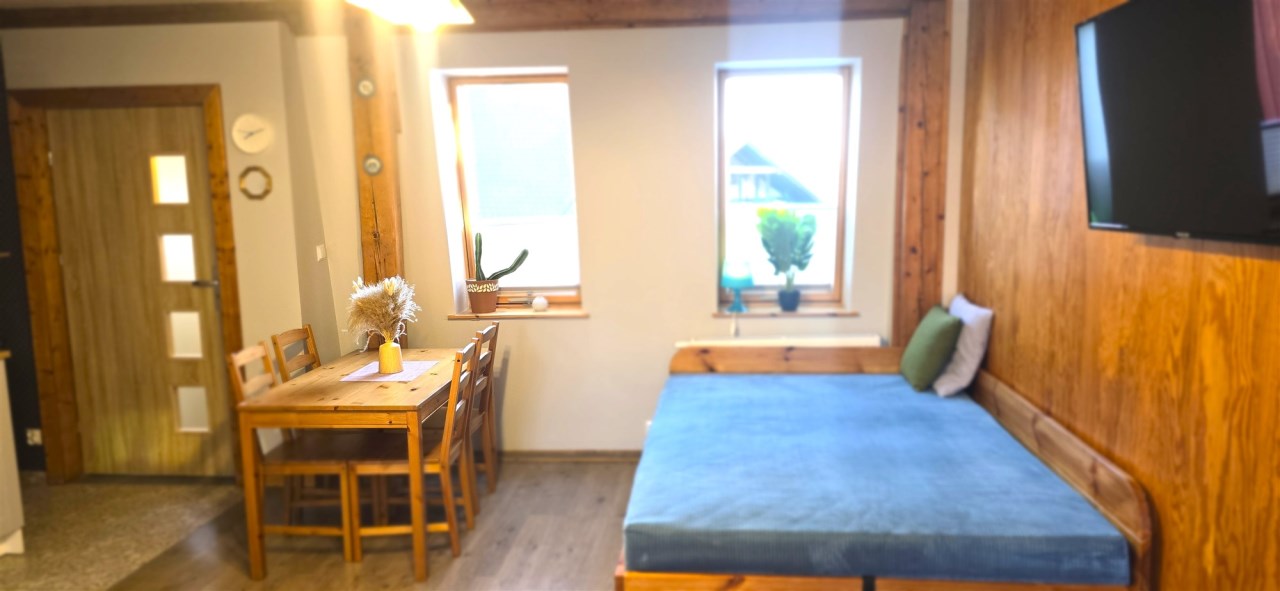 Pensjonat oferuje 4 komfortowe apartamenty (2 na parterze oraz 2 na I piętrze) składające się z przestronnego salonu z aneksem kuchennym i łazienką (każdy), wyjście na taras, ogród. Obiekt cieszy się dużym zainteresowaniem turystów dzięki doskonałej lokalizacji.